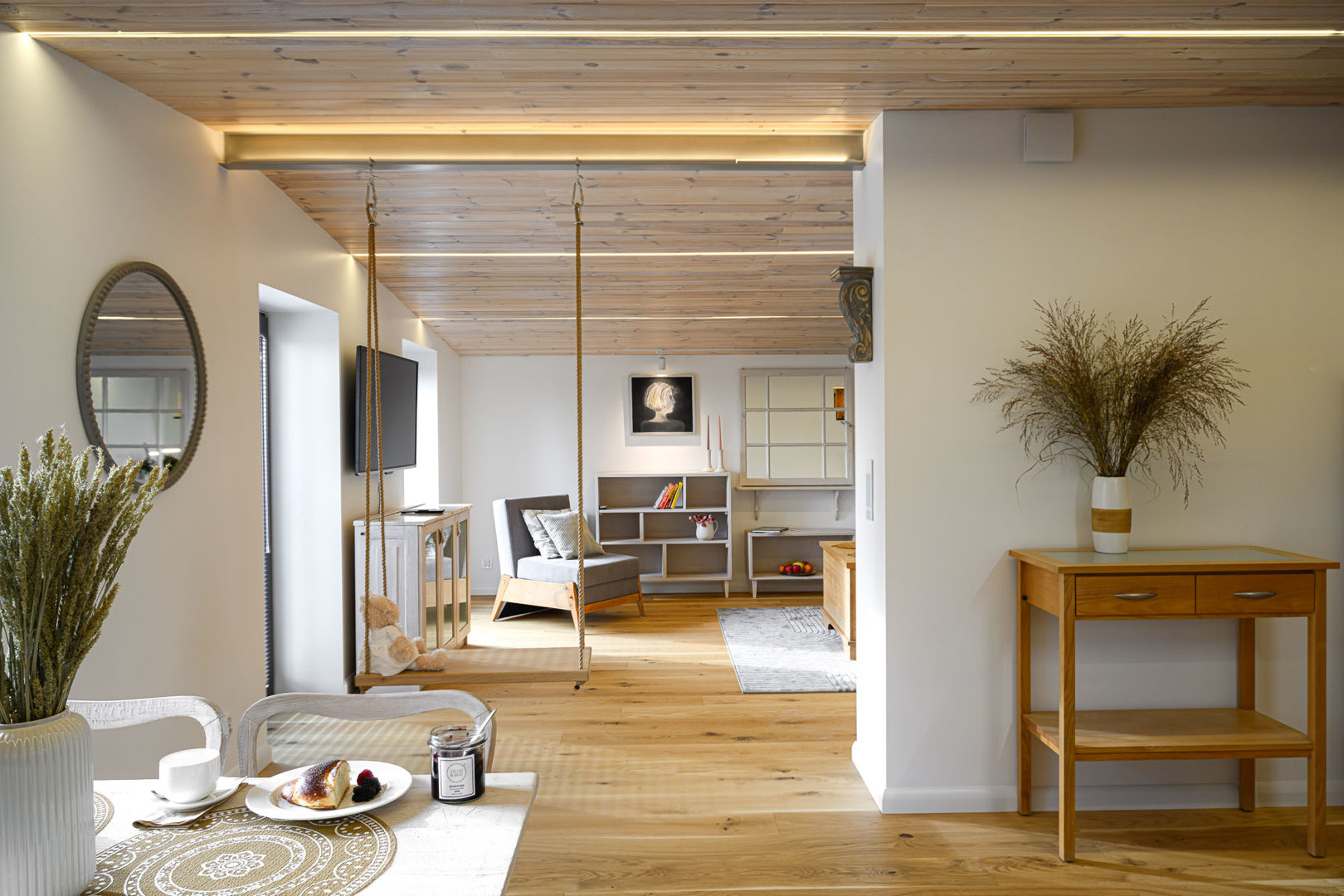 The interior was created on spacious attic with big windows to  the floor. You will be reminded of your childhood years by a wooden swing hanging between the seating area and kitchen.